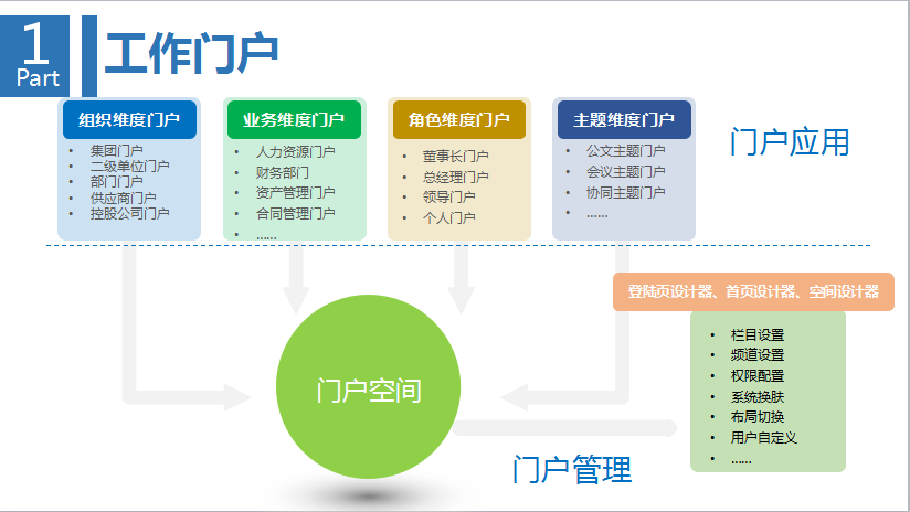 第一環(huán),也是最基本的,企業(yè)內(nèi)部的工作協(xié)作。實(shí)現(xiàn)組織維度門(mén)戶(hù)、業(yè)務(wù)維度門(mén)戶(hù)的建立,二元化工作流,知識(shí)的沉淀與分享,企業(yè)文化建設(shè)。