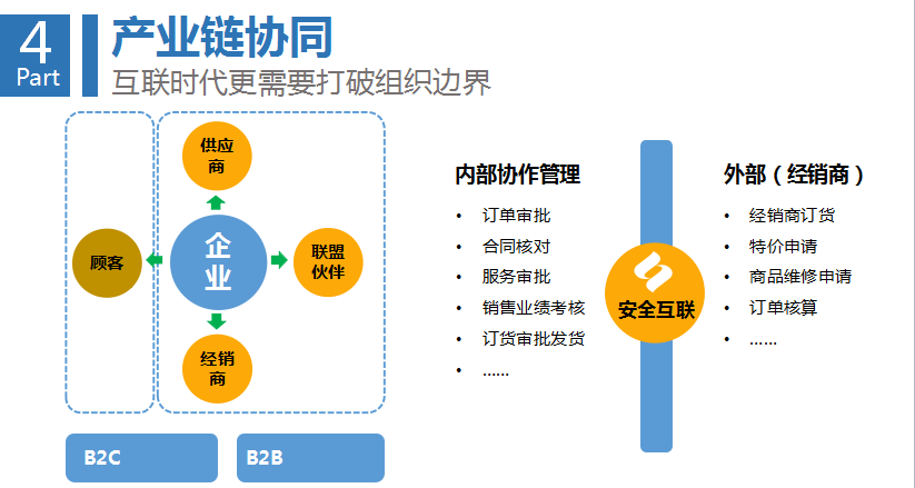 第四環(huán)是產(chǎn)業(yè)鏈協(xié)同。企業(yè)要在生態(tài)中間完成協(xié)作,比如說(shuō)供應(yīng)鏈、訂單、交易、分享的協(xié)作,企業(yè)的生態(tài)和上下游之間要完成相互協(xié)作。